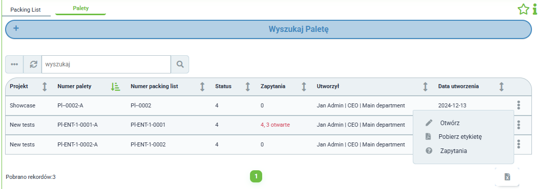 Zakładka Palety umożliwia szybki przegląd wszystkich przygotowanych jednostek ładunkowych. Każda paleta zawiera kluczowe informacje, takie jak projekt, numer palety, numer powiązanej listy pakunkowej, status, utworzony przez oraz data utworzenia. Intuicyjne action menu pozwala na błyskawiczny dostęp do podglądu, pobrania etykiety lub przejrzenia powiązanych zapytań.