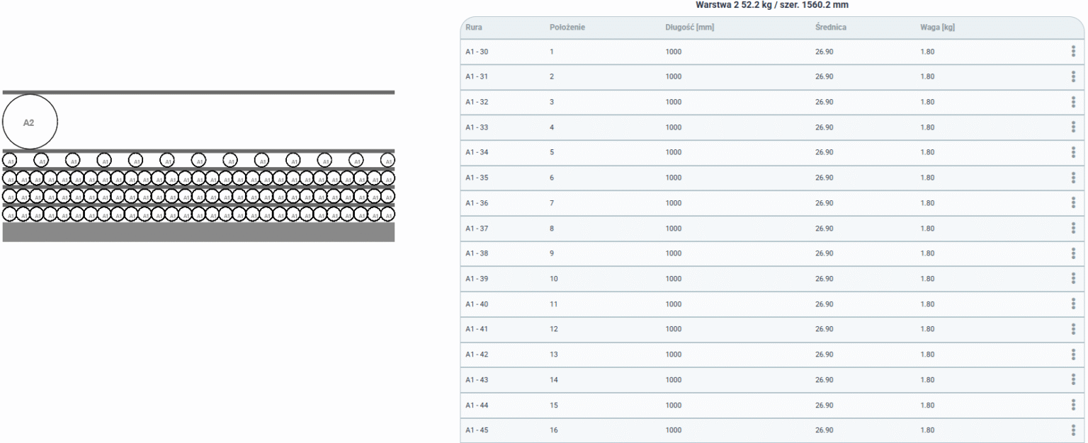 - Pełna specyfikacja warstw – długość, średnica, waga i położenie każdej rury opisane warstwa po warstwie